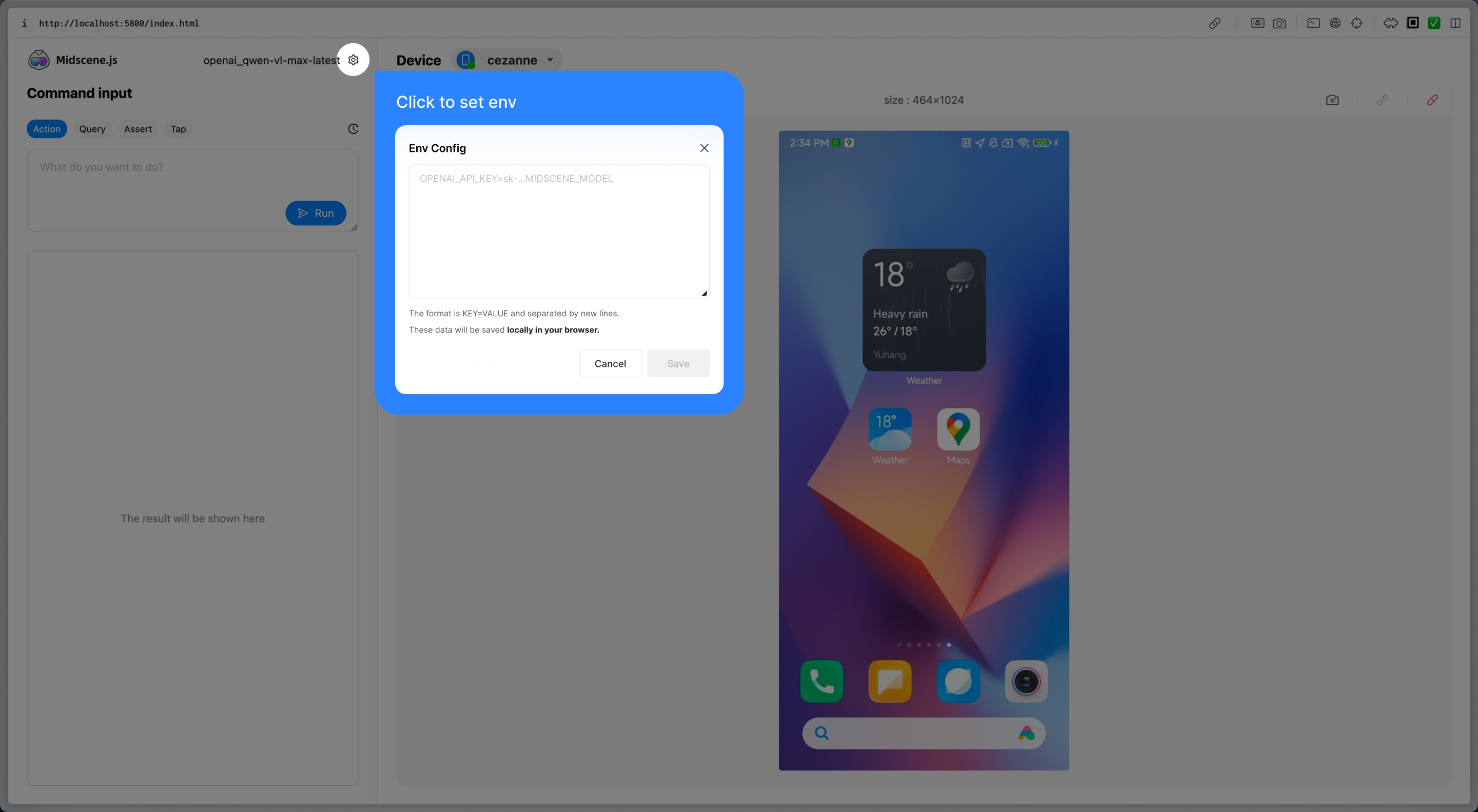 Playground is the fastest way to validate the connection and observe AI-driven steps without writing code. It shares the same core as @midscene/android, so anything that works here will behave the same once scripted.